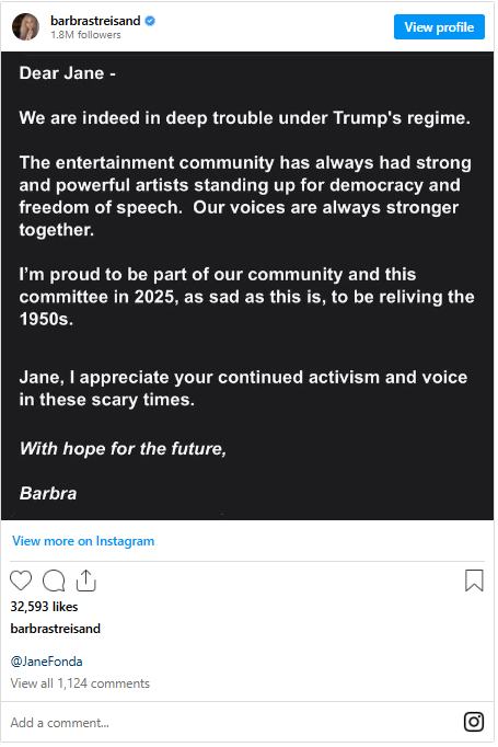 “I’m proud to be part of our community and this committee in 2025, as sad as this is, to be reliving the 1950s,” she continued. “Jane, I appreciate your continued activism and voice in these scary times. With hope for the future, Barbra.”